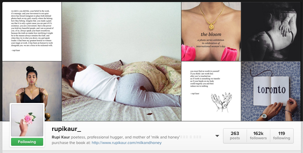 Social media did not exist when I was a student in the 90s, so our audience was extremely limited. Trust me, you do NOT want to know some of the projects my classmates came up with for our course assignments. But times have changed. Kaur is a published poet and a public figure with a large following on Instagram. She knows what she’s doing.